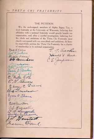 Psi Chapter History - 1917-1937Theta Chi • 1915-1916 • 1917-1937 • 1941-1949 • 1950-1964 • 1965-1984 • 1985-2005At the beginning of the next semester, the members of Alpha Sigma Tau decided to seek a berth in Theta Chi Fraternity, “believing that the ideals and ambitions of the Theta Chi Fraternity most closely correspond[ed] with [their] ideals and ambitions.”